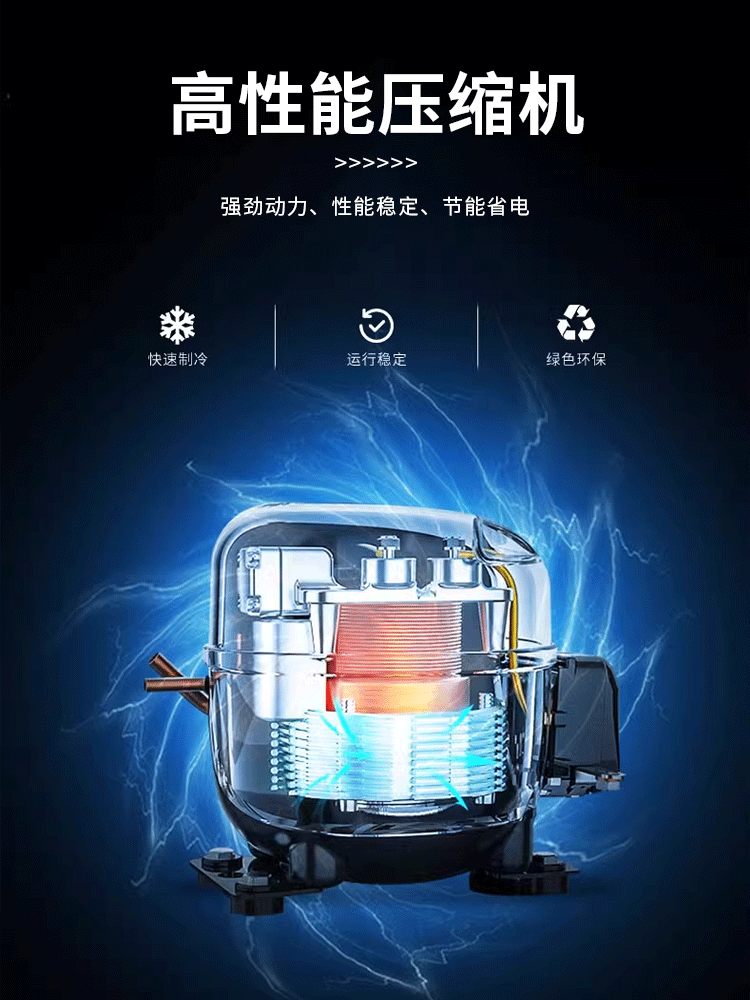 采用品牌压缩机:制冷快、低能耗、噪音小。