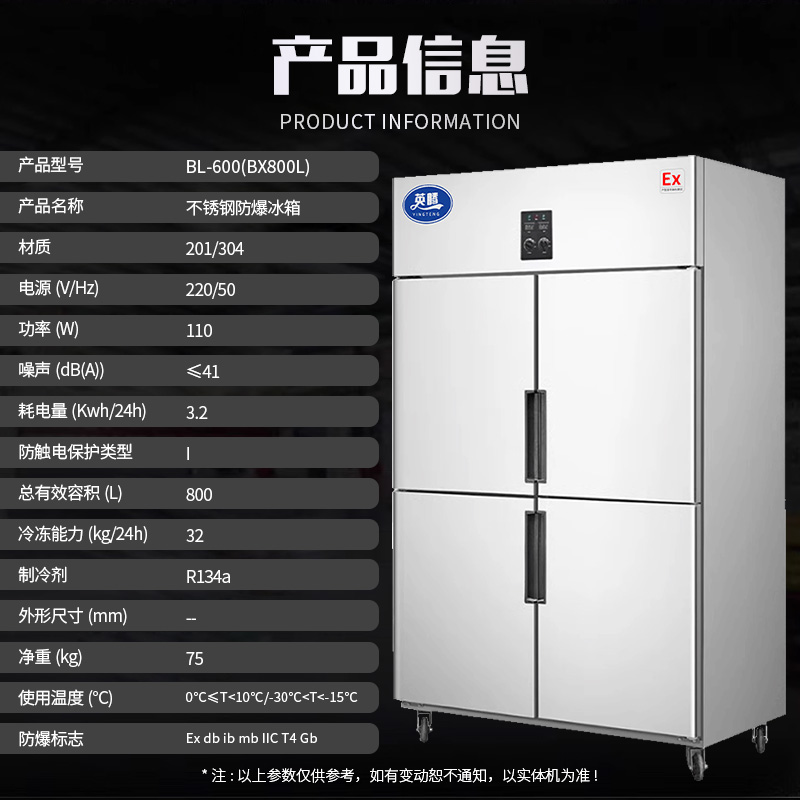 防爆冰箱广泛应用于:石油、化学化工、医药、航空航天、实验室、储藏等场所具有IIA、IIB、IC级,温度组别为T4的爆炸性气体混合物的l区或2区内部危险性场所,BL系列工业级防爆冰箱/冷柜/冷冻冷藏柜是采用集成防爆技术,按工业环境使用要求制造的IC级防爆冰箱。