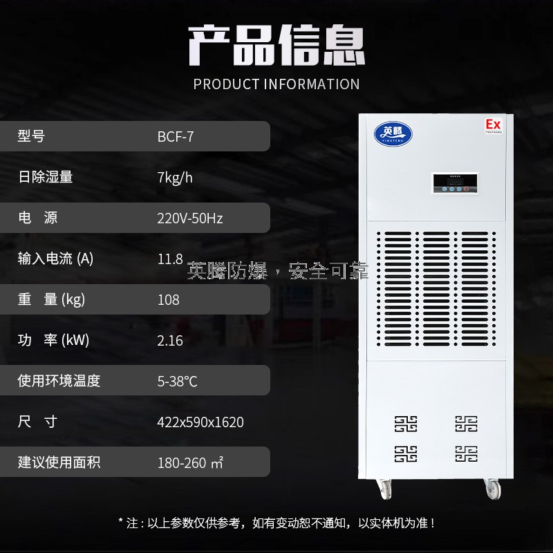 防爆除湿机系列机型(以下简称除湿机)的外形和使用与常规除湿机相同,防爆除湿机经过特殊的技术加工工艺处理,可广泛应用于国防、科研、石油、化工、医药、工厂等存在或可能存在IA、1B级,T1~T4组可燃性气体蒸汽与空气混合形成的爆炸危险场所等环境下的除湿要求的场所设计的特种除湿设备,具有降湿功能。本产品外形美观,设计新颖和具有安装维修方便等特点,除湿机采用名牌压缩机、微电脑控制、噪声低、温度显示、直观了然、性能优越、操作简便等众多优点。本公司可根据客户的不同要求设计及生产(可定制:防爆管道除湿机、防爆吊装除湿机、防爆降温管道除湿机、防爆调温管道除湿机、管道式防爆恒温恒湿机、水冷型防爆管道除湿机、防爆恒湿机等防爆特种控湿控温设备)。