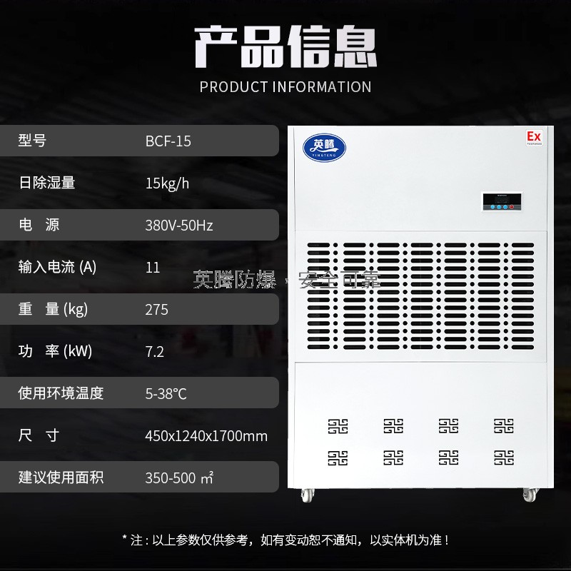 防爆除湿机系列机型(以下简称除湿机)的外形和使用与常规除湿机相同,防爆除湿机经过特殊的技术加工工艺处理,可广泛应用于国防、科研、石油、化工、医药、工厂等存在或可能存在IA、1B级,T1~T4组可燃性气体蒸汽与空气混合形成的爆炸危险场所等环境下的除湿要求的场所设计的特种除湿设备,具有降湿功能。本产品外形美观,设计新颖和具有安装维修方便等特点,除湿机采用名牌压缩机、微电脑控制、噪声低、温度显示、直观了然、性能优越、操作简便等众多优点。本公司可根据客户的不同要求设计及生产(可定制:防爆管道除湿机、防爆吊装除湿机、防爆降温管道除湿机、防爆调温管道除湿机、管道式防爆恒温恒湿机、水冷型防爆管道除湿机、防爆恒湿机等防爆特种控湿控温设备)。