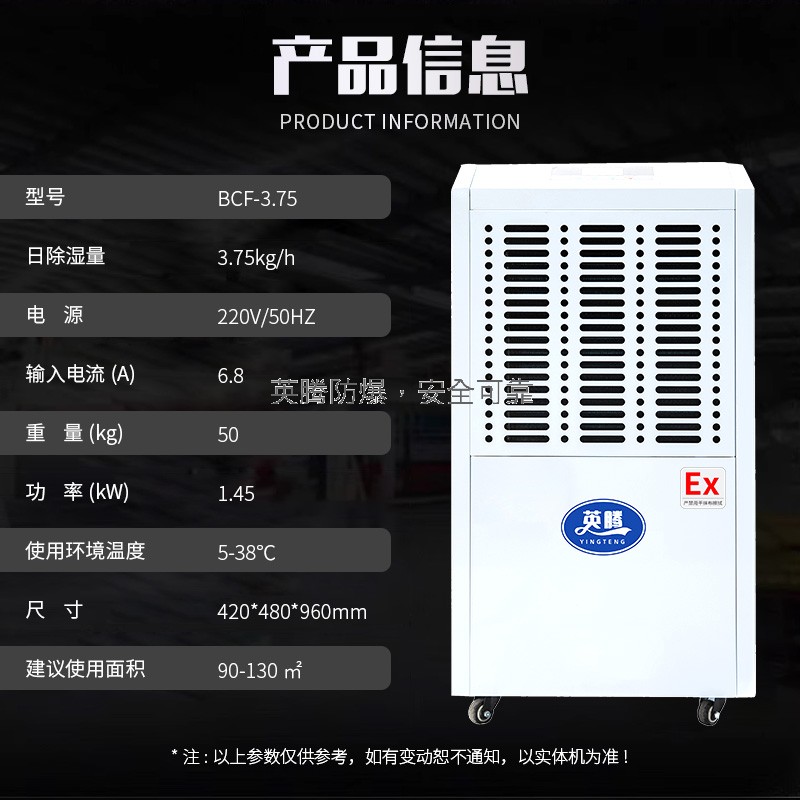 防爆除湿机系列机型(以下简称除湿机)的外形和使用与常规除湿机相同,防爆除湿机经过特殊的技术加工工艺处理,可广泛应用于国防、科研、石油、化工、医药、工厂等存在或可能存在IA、1B级,T1~T4组可燃性气体蒸汽与空气混合形成的爆炸危险场所等环境下的除湿要求的场所设计的特种除湿设备,具有降湿功能。本产品外形美观,设计新颖和具有安装维修方便等特点,除湿机采用名牌压缩机、微电脑控制、噪声低、温度显示、直观了然、性能优越、操作简便等众多优点。本公司可根据客户的不同要求设计及生产(可定制:防爆管道除湿机、防爆吊装除湿机、防爆降温管道除湿机、防爆调温管道除湿机、管道式防爆恒温恒湿机、水冷型防爆管道除湿机、防爆恒湿机等防爆特种控湿控温设备)。